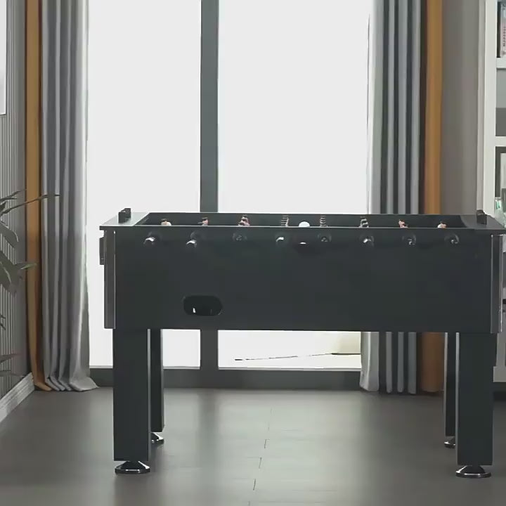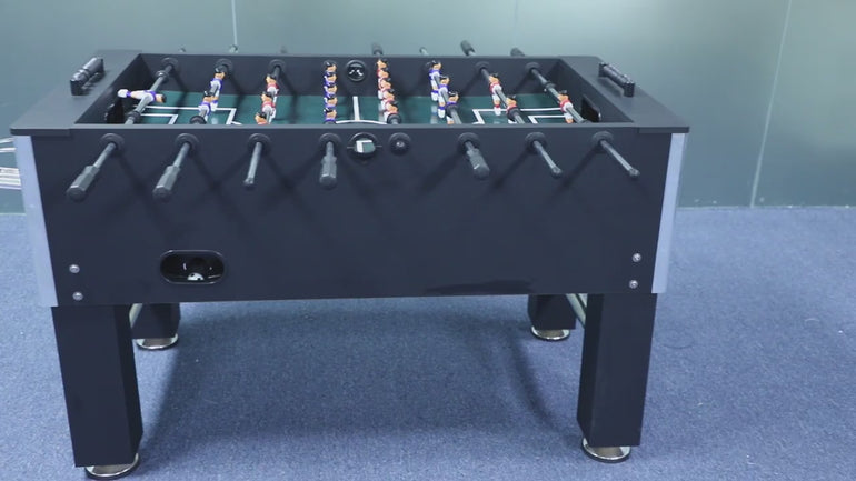 HIGH PERFORMANCE: This full-size foosball table is black with chrome accents so it is sure to blend in with any contemporary setting. Plus, ball bearings allow the rods to spin smoothly, and the ergonomic handles support comfortable wrist movement during play. The corners are raised to ensure that the ball won't get stuck during an intense game.